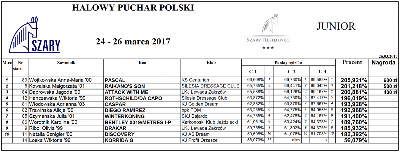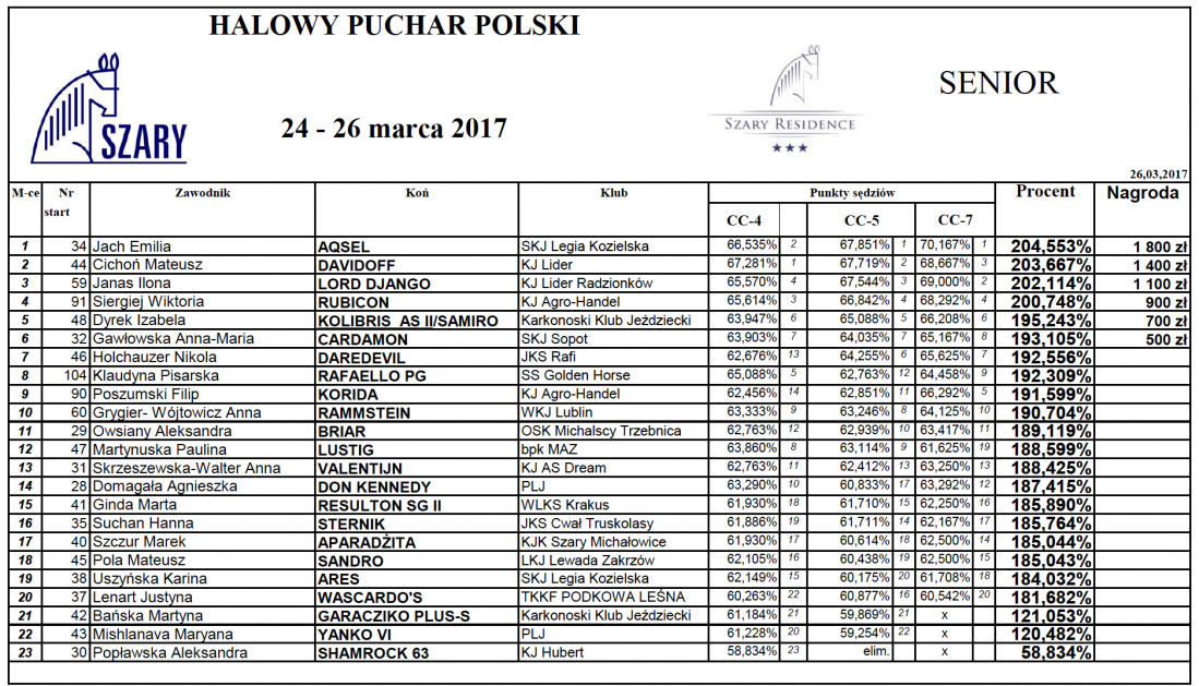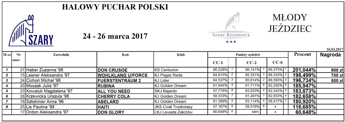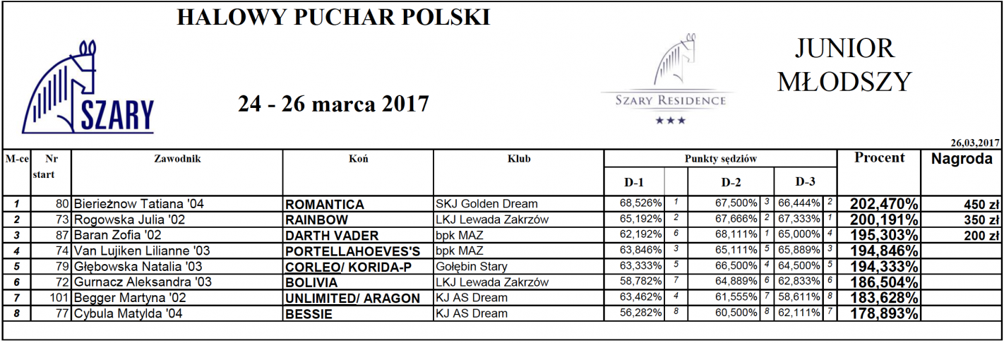 | 51 | Martyna | Begger | Juniorzy Młodsi Konie | Puchar Polski | Unlimited |