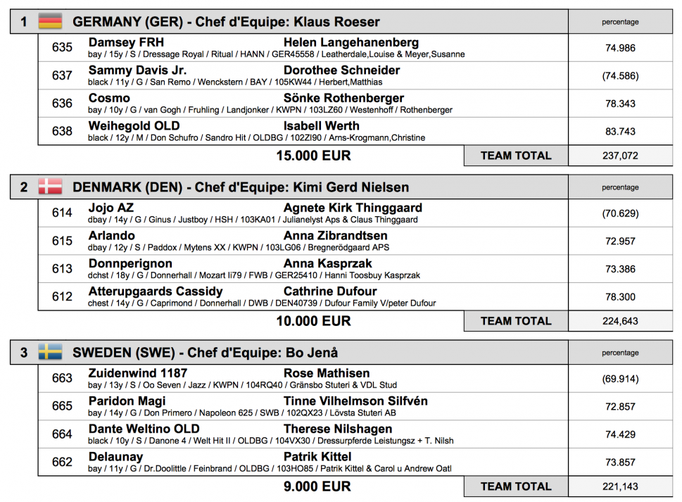 Podium Freestyle ME Seniorów 2017 - od lewej : Sonke Rothenberger (srebro ) Isabell Werth (złoto ), Cathrine Dufour (brąz)