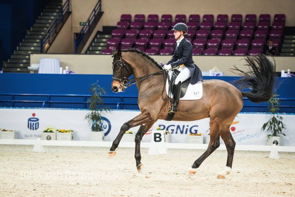 Magdalena Jura - Już za niecałe 2 tygodnie jedziemy na CDI Compiegne z Emilem. Nie mogę się także doczekać powrotu na arenę z Ronem. Jeśli wszystko dopisze i jeśli uda się ‘załapać’ na listę startową to już za kilka tygodni powrócimy z Romanem na czworobok GP. Jest także Rasco, koń, o którym mój mąż marzył przez pięć lat! Zobaczył go jako 4latka i przez te lat starał się go kupić. Koń o ogromnych możliwościach ale bardzo zapóźniony, całe życie spędził w lekkiej juniorskiej pracy i na pastwisku. Mam go od 9 miesięcy. W tym krótkim czasie udało nam się przejść od pełnego buntu wobec jeźdźca i elementów N klasy do pełnego zaangażowania, radości z pracy na poziomie Św. Jerzego. Przyznam, że na początku siadałam na niego i płakałam ze strachu. Teraz wprowadzam piaff - pasaż i dalej zdarza mi się płakać, ale teraz już raczej ze szczęścia! Jeśli dobrze pójdzie niebawem zadebiutujemy w małej a może dużej rundzie. Nie możemy zapomnieć także o Billu (Billi Elliot), koń naszej hodowli, zwycięzca MPMK w kategorii koni 5 letnich. Syn Mistrzyni Polski Banderoli. Mój drugi koń doprowadzony do GP. Niestety tuż przed MP 2015 odniósł poważną kontuzję. Teraz po 18 miesiącach intensywnego leczenia i rehabilitacji myślę powoli o powrocie Billego, który już od kilku miesięcy pracuje, chętnie pasażuje i piaffuje, ale uważam na niego. Choć ma 12 lat to ponowne starty zacznie w małej rundzie, a potem zobaczymy.