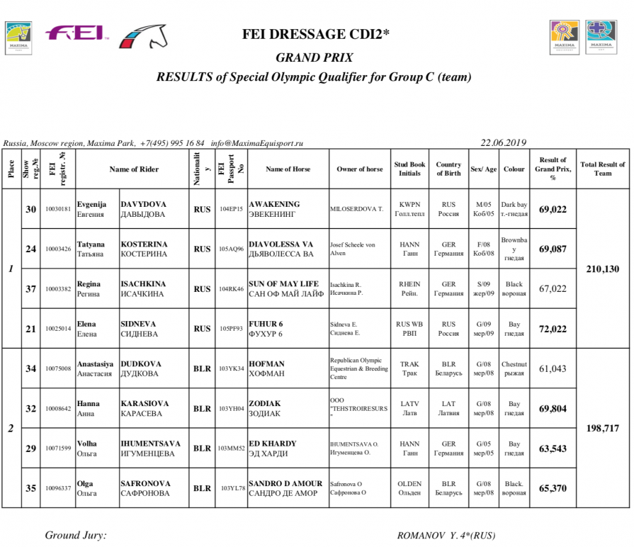Najlepiej w ekipie RUS pojechała Elena Sidneva na fenomenalnym FUHUR 6 z wynikiem 72,022%. Najlepsza w ekipie BLR Hanna Karasiova na ZODIAK uzyskała 69,804% ( był to drugi wynik konkursu GP )