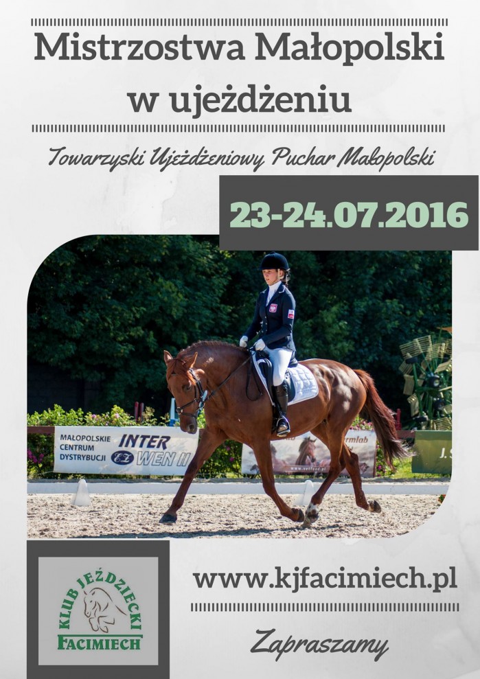 Serdecznie zapraszamy na 5 edycję Towarzyskiego Ujeżdżeniowego Pucharu Małopolski w KJ Facimiech. To świetna okazja aby rozpocząć swoją przygodę z ujeżdżeniem zwłaszcza, że organizator jak co roku przygotował atrakcyjne nagrody.