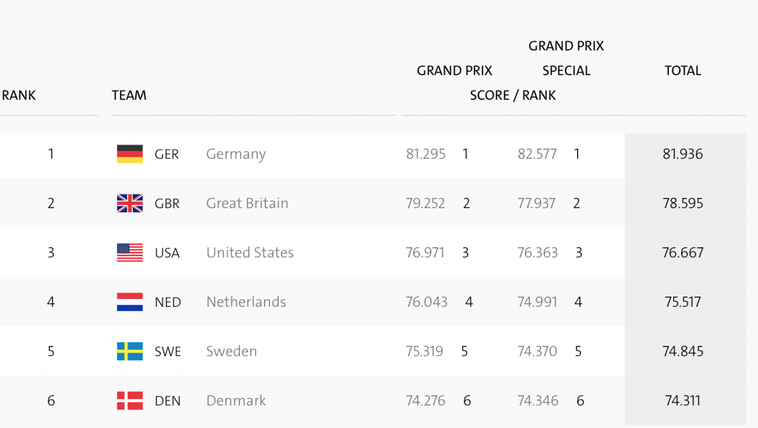 USA: Steffen Peters (Legolas 92), Laura Graves (Verdades), Kasey Perry-Glass (Dublet), Alison Brock (Rosevelt). Reserve: Shelly Francis (Doktor).