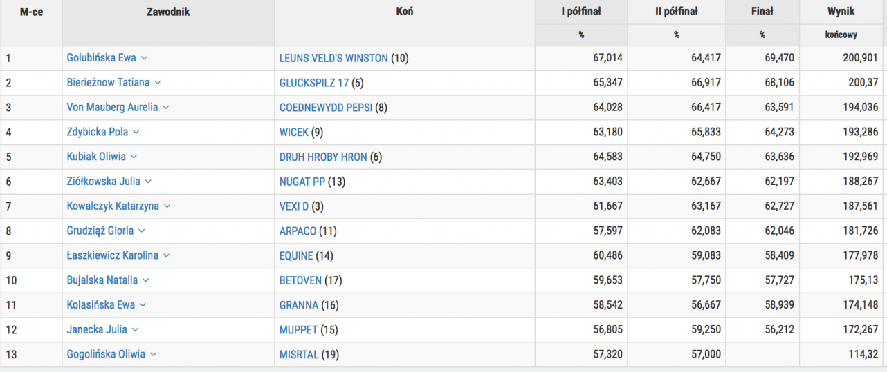 WYNIKI I PÓŁFINAŁ P6 1m. Ewa Golubińska / KJ Plejada / LV Winston / 67,014%