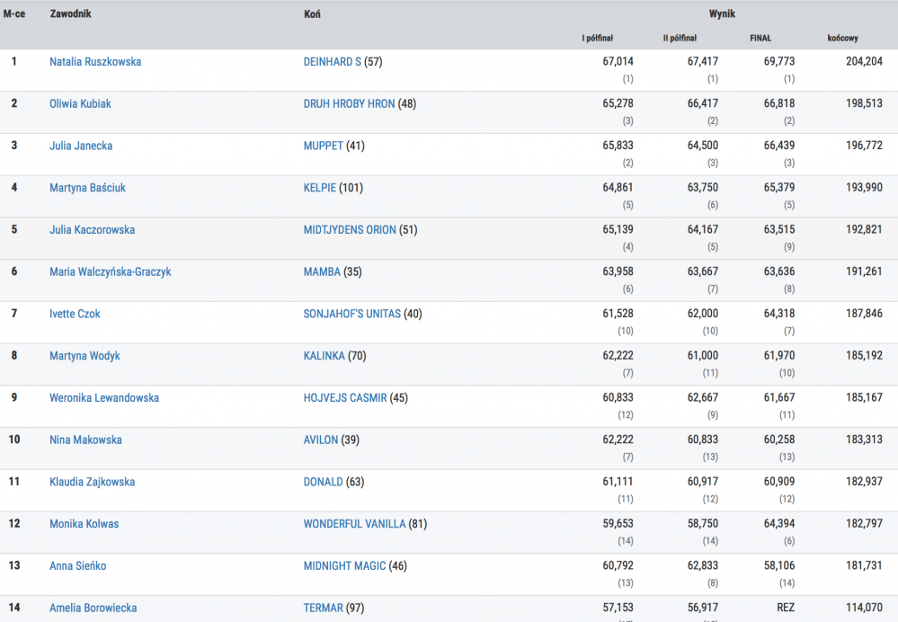 | 1 | DEINHARD S | Ruszkowska Natalia (JM.2004) | AZS PW | 67,014 | 67,417 | 69,773 | 204,204 | |