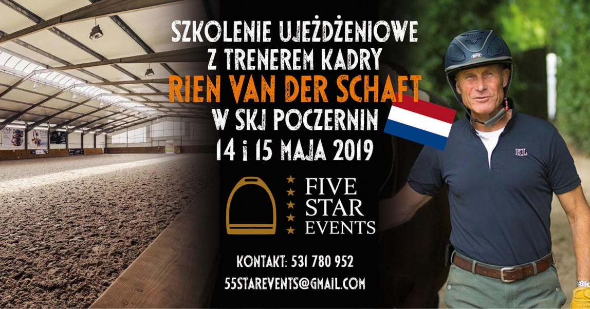 Zapraszamy na elitarne konsultacje z ogromnym miłośnikiem zwierząt i wybitnym jeźdźcem dyscypliny ujeżdżenia, obecnym trenerem kadry Finlandii, trenerem kadry Holandii sprzed roku, trenerem który doprowadził masę koni do Grand Prix, byłym jeźdźcem kadry narodowej Holandii, uczestnikiem Olimpiady, Mistrzostw Świata i Mistrzostw Europy- Rienem van der Schaftem. Szkolenie obejmuje dwa dni 14 i 15 maja 2019 r. i odbędzie się w SKJ Poczernin. Organizatorem jest Five Star Events.