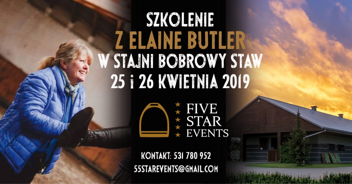 Zapraszamy na szkolenie z Elaine Butler, prowadzoną metodami Ride With Your Mind (świadome jeździectwo). Szkolenie obejmuje dwa dni 25 i 26.04.19 i odbędzie się w Stajni Bobrowy Staw, jest kierowane dla jeźdźców zarówno ujeżdżeniowych jak i skokowych. Organizatorem jest Five Star Events.