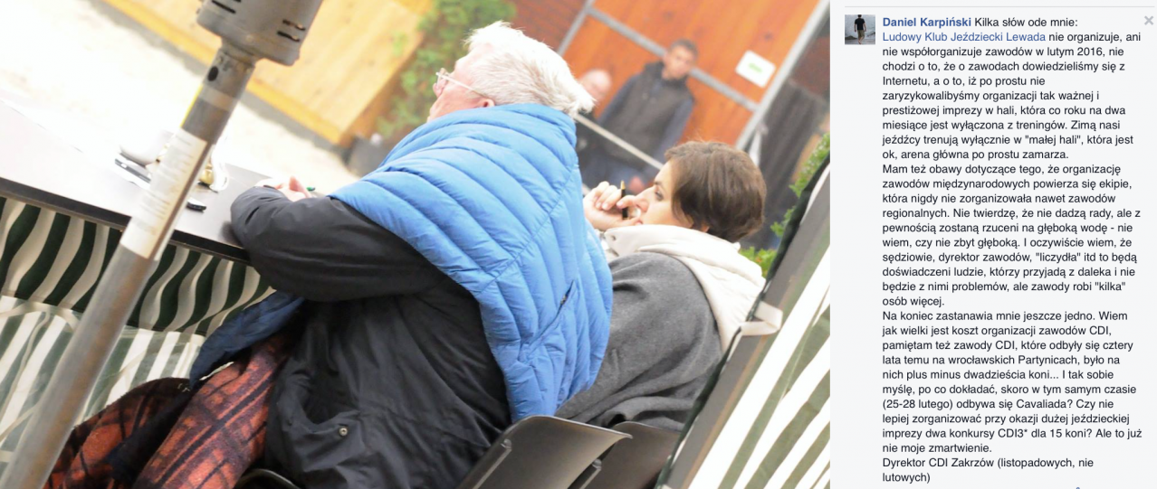 Ludowy Klub Jeździecki Lewada nie organizuje, ani nie współorganizuje zawodów w lutym 2016, nie chodzi o to, że o zawodach dowiedzieliśmy się z Internetu, a o to, iż po prostu nie zaryzykowalibyśmy organizacji tak ważnej i prestiżowej imprezy w hali, która co roku na dwa miesiące jest wyłączona z treningów. Zimą nasi jeźdźcy trenują wyłącznie w "małej hali", która jest ok, arena główna po prostu zamarza. Mam też obawy dotyczące tego, że organizację zawodów międzynarodowych powierza się ekipie, która nigdy nie zorganizowała nawet zawodów regionalnych. Nie twierdzę, że nie dadzą rady, ale z pewnością zostaną rzuceni na głęboką wodę - nie wiem, czy nie zbyt głęboką. I oczywiście wiem, że sędziowie, dyrektor zawodów, "liczydła" itd to będą doświadczeni ludzie, którzy przyjadą z daleka i nie będzie z nimi problemów, ale zawody robi "kilka" osób więcej.Na koniec zastanawia mnie jeszcze jedno. Wiem jak wielki jest koszt organizacji zawodów CDI, pamiętam też zawody CDI, które odbyły się cztery lata temu na wrocławskich Partynicach, było na nich plus minus dwadzieścia koni... I tak sobie myślę, po co dokładać, skoro w tym samym czasie (25-28 lutego) odbywa się Cavaliada? Czy nie lepiej zorganizować przy okazji dużej jeździeckiej imprezy dwa konkursy CDI3* dla 15 koni? Ale to już nie moje zmartwienie.