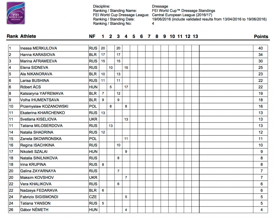 Ranking Ligi Europu Centralnej Pucharu Świata po zawodach w Brnie 19/06/2016