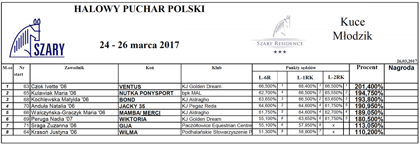 | 71 | Karolina | Czyż | Juniorzy Młodsi Kuce | Puchar Polski | Cassandra |