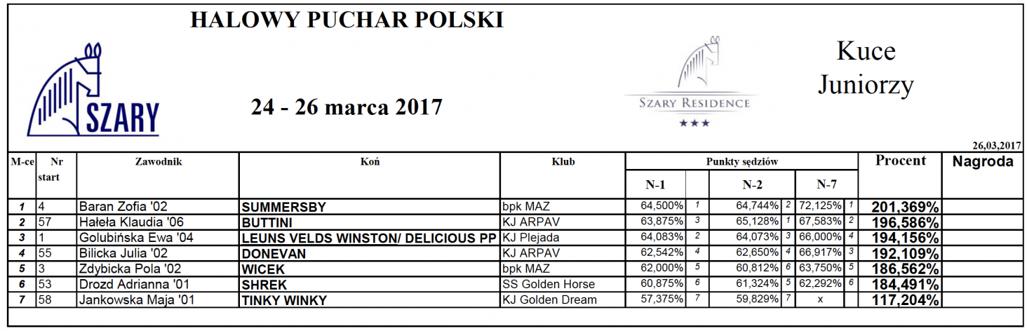| 69 | Zofia | Baran | Juniorzy Młodsi Kuce | Puchar Polski | Summersby |
