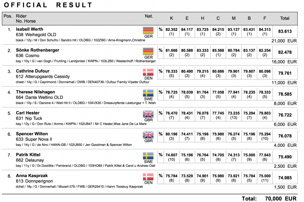 Podium Freestyle ME Seniorów 2017 - od lewej : Sonke Rothenberger (srebro ) Isabell Werth (złoto ), Cathrine Dufour (brąz)