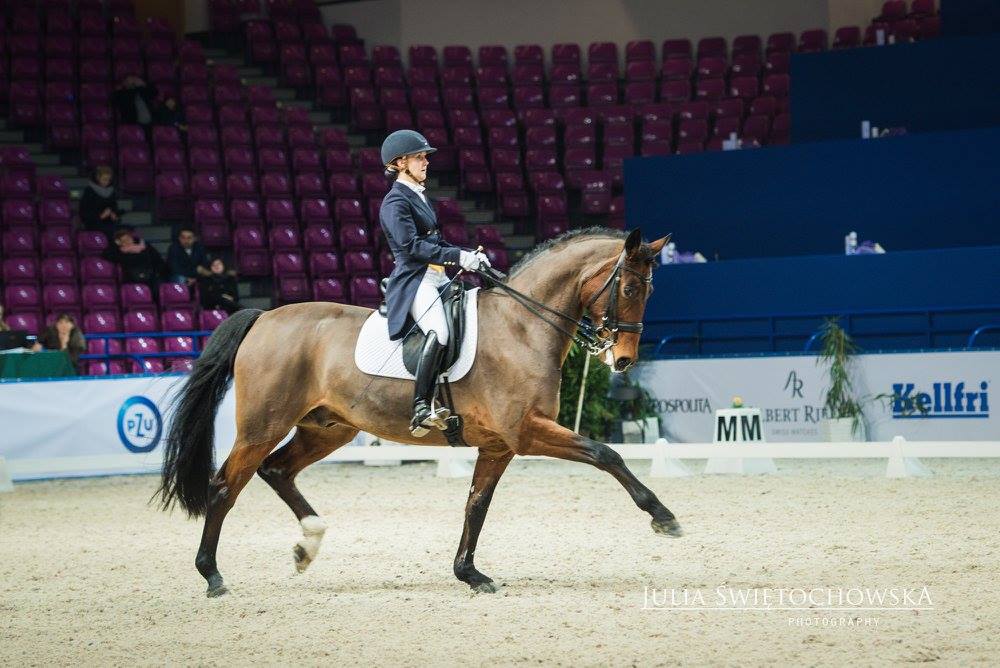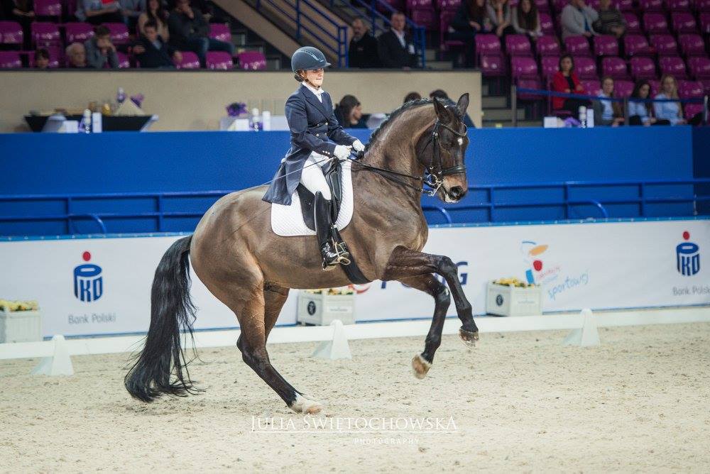 Magdalena Jura - Już za niecałe 2 tygodnie jedziemy na CDI Compiegne z Emilem. Nie mogę się także doczekać powrotu na arenę z Ronem. Jeśli wszystko dopisze i jeśli uda się ‘załapać’ na listę startową to już za kilka tygodni powrócimy z Romanem na czworobok GP. Jest także Rasco, koń, o którym mój mąż marzył przez pięć lat! Zobaczył go jako 4latka i przez te lat starał się go kupić. Koń o ogromnych możliwościach ale bardzo zapóźniony, całe życie spędził w lekkiej juniorskiej pracy i na pastwisku. Mam go od 9 miesięcy. W tym krótkim czasie udało nam się przejść od pełnego buntu wobec jeźdźca i elementów N klasy do pełnego zaangażowania, radości z pracy na poziomie Św. Jerzego. Przyznam, że na początku siadałam na niego i płakałam ze strachu. Teraz wprowadzam piaff - pasaż i dalej zdarza mi się płakać, ale teraz już raczej ze szczęścia! Jeśli dobrze pójdzie niebawem zadebiutujemy w małej a może dużej rundzie. Nie możemy zapomnieć także o Billu (Billi Elliot), koń naszej hodowli, zwycięzca MPMK w kategorii koni 5 letnich. Syn Mistrzyni Polski Banderoli. Mój drugi koń doprowadzony do GP. Niestety tuż przed MP 2015 odniósł poważną kontuzję. Teraz po 18 miesiącach intensywnego leczenia i rehabilitacji myślę powoli o powrocie Billego, który już od kilku miesięcy pracuje, chętnie pasażuje i piaffuje, ale uważam na niego. Choć ma 12 lat to ponowne starty zacznie w małej rundzie, a potem zobaczymy.