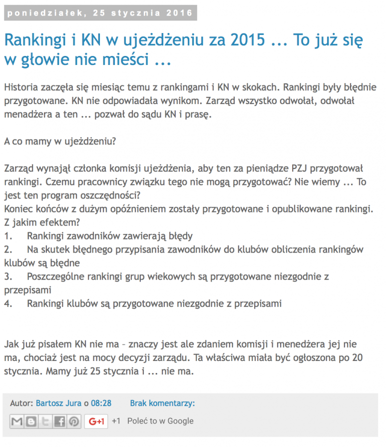 Komentarz dot. opublikowanego przez PZJ / Komisje Ujeżdżenia rankingu - autor Bartosz Jura