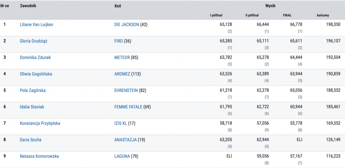 | Miejsce | Nazwa konia | Zawodnik | Klub | I półfinał | II półfinał | FINAŁ | końcowy | Nagroda |