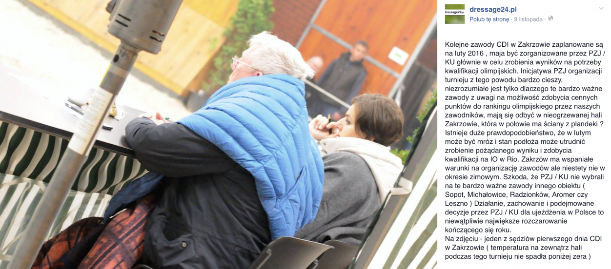 " Kolejne zawody CDI w Zakrzowie zaplanowane są na luty 2016 , maja być zorganizowane przez PZJ / KU głównie w celu zrobienia wyników na potrzeby kwalifikacji olimpijskich. Inicjatywa PZJ organizacji turnieju z tego powodu bardzo cieszy, niezrozumiałe jest tylko dlaczego te bardzo ważne zawody z uwagi na możliwość zdobycia cennych punktów do rankingu olimpijskiego przez naszych zawodników, mają się odbyć w nieogrzewanej hali Zakrzowie, która w połowie ma ściany z plandeki ? Istnieje duże prawdopodobieństwo, że w lutym może być mróz i stan podłoża może utrudnić zrobienie pożądanego wyniku i zdobycia kwalifikacji na IO w Rio. Zakrzów ma wspaniałe warunki na organizację zawodów ale niestety nie w okresie zimowym. Szkoda, że PZJ / KU nie wybrali na te bardzo ważne zawody innego obiektu ( Sopot, Michałowice, Radzionków, Aromer czy Leszno ) Działanie, zachowanie i podejmowane decyzje przez PZJ / KU dla ujeżdżenia w Polsce to niewątpliwie największe rozczarowanie kończącego się roku.
