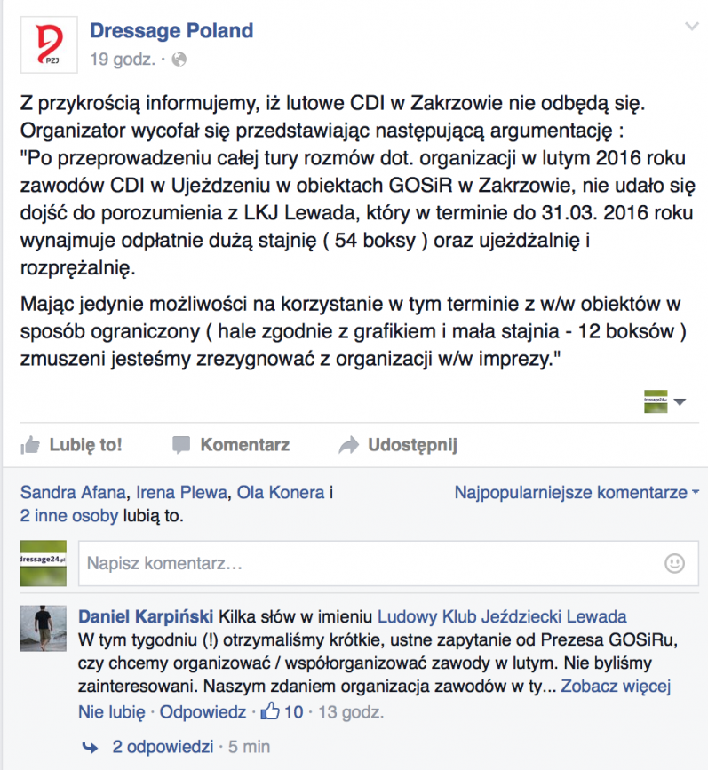 Ludowy Klub Jeździecki Lewada nie organizuje, ani nie współorganizuje zawodów w lutym 2016, nie chodzi o to, że o zawodach dowiedzieliśmy się z Internetu, a o to, iż po prostu nie zaryzykowalibyśmy organizacji tak ważnej i prestiżowej imprezy w hali, która co roku na dwa miesiące jest wyłączona z treningów. Zimą nasi jeźdźcy trenują wyłącznie w "małej hali", która jest ok, arena główna po prostu zamarza. Mam też obawy dotyczące tego, że organizację zawodów międzynarodowych powierza się ekipie, która nigdy nie zorganizowała nawet zawodów regionalnych. Nie twierdzę, że nie dadzą rady, ale z pewnością zostaną rzuceni na głęboką wodę - nie wiem, czy nie zbyt głęboką. I oczywiście wiem, że sędziowie, dyrektor zawodów, "liczydła" itd to będą doświadczeni ludzie, którzy przyjadą z daleka i nie będzie z nimi problemów, ale zawody robi "kilka" osób więcej.Na koniec zastanawia mnie jeszcze jedno. Wiem jak wielki jest koszt organizacji zawodów CDI, pamiętam też zawody CDI, które odbyły się cztery lata temu na wrocławskich Partynicach, było na nich plus minus dwadzieścia koni... I tak sobie myślę, po co dokładać, skoro w tym samym czasie (25-28 lutego) odbywa się Cavaliada? Czy nie lepiej zorganizować przy okazji dużej jeździeckiej imprezy dwa konkursy CDI3* dla 15 koni? Ale to już nie moje zmartwienie.
