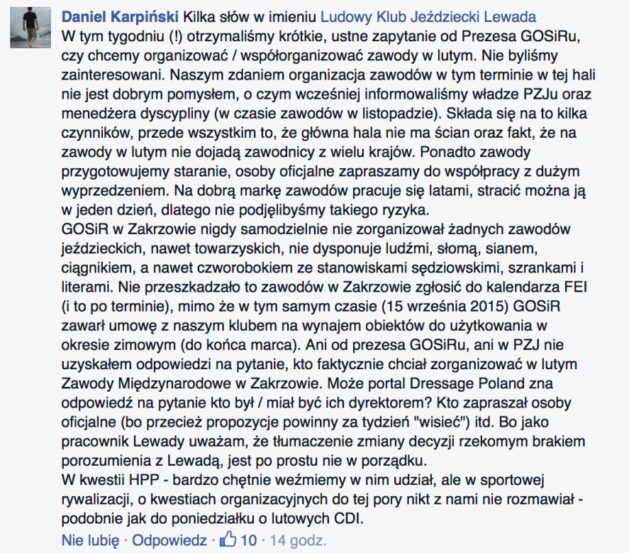 " Dlaczego PZJ opublikował taki nieprawdziwy komunikat? PZJ i kierownictwu ośrodka zabrakło odwagi do przyznania się, że nie podołają organizacji CDI zimą ryzykując przyjazd zawodników z pół Europy do zamarzniętej hali. Najlepiej niekompetencję PZJ i ośrodka w Zakrzowie zrzucić na LKJ Lewada. A jak wiemy konflikt na linii komisja ujeżdżenia - LKJ Lewada Zakrzów znalazł się na wokandzie dwóch sądów. Dziwię się, że Zarząd pozwala na dalszą eskalację i wprowadzanie środowiska w błąd, a także ośmieszanie PZJ na forum FEI.